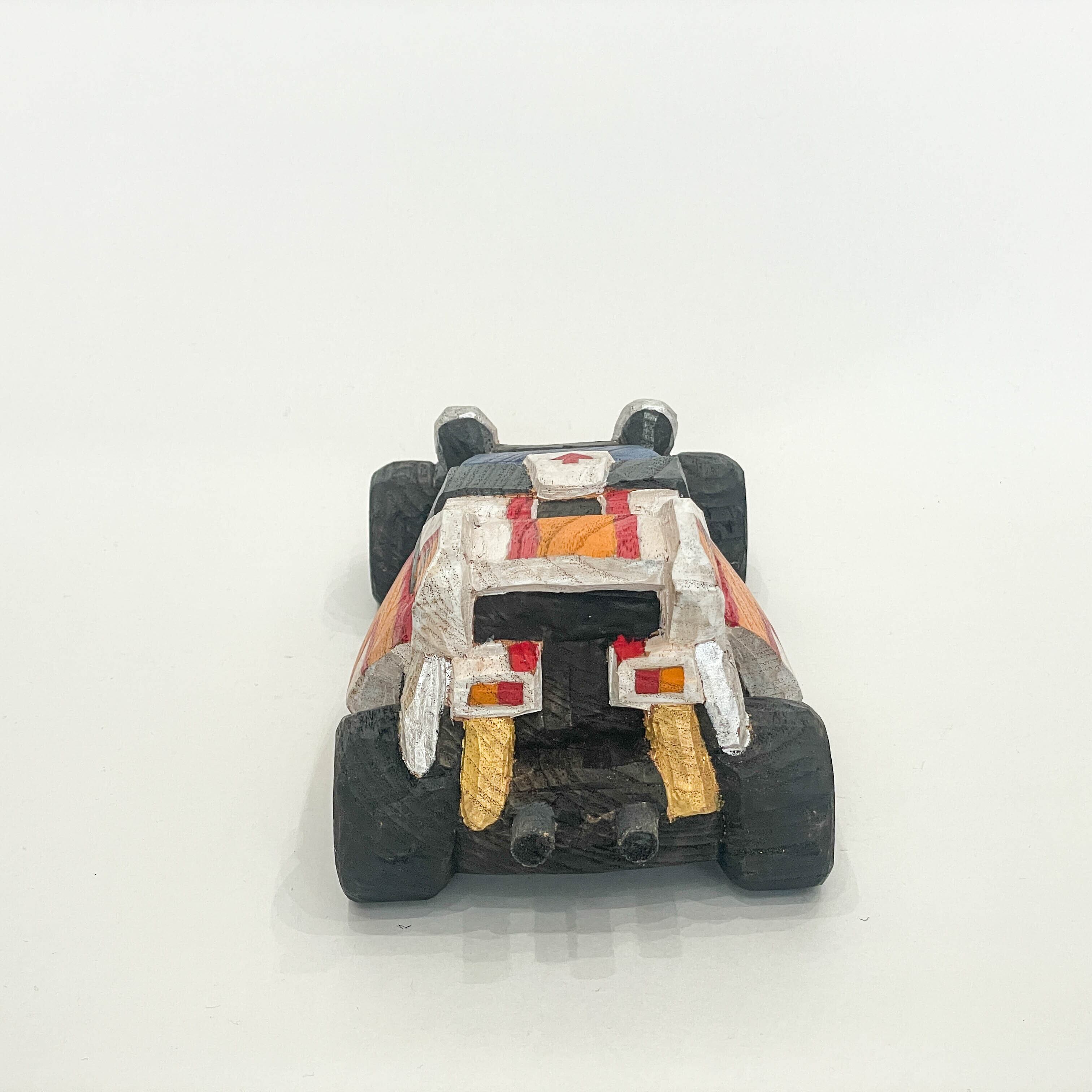 Inspired initially by carving his own car, Yamasaki then turned to model vehicles from films, anime, and classic real-life cars. Crafted from photos with a blend of imagination, each piece captures the distinct features of its subject, bringing out the warmth of wood. Although not as detailed as figurines, these sculptures evoke the essence of each vehicle with a unique charm.