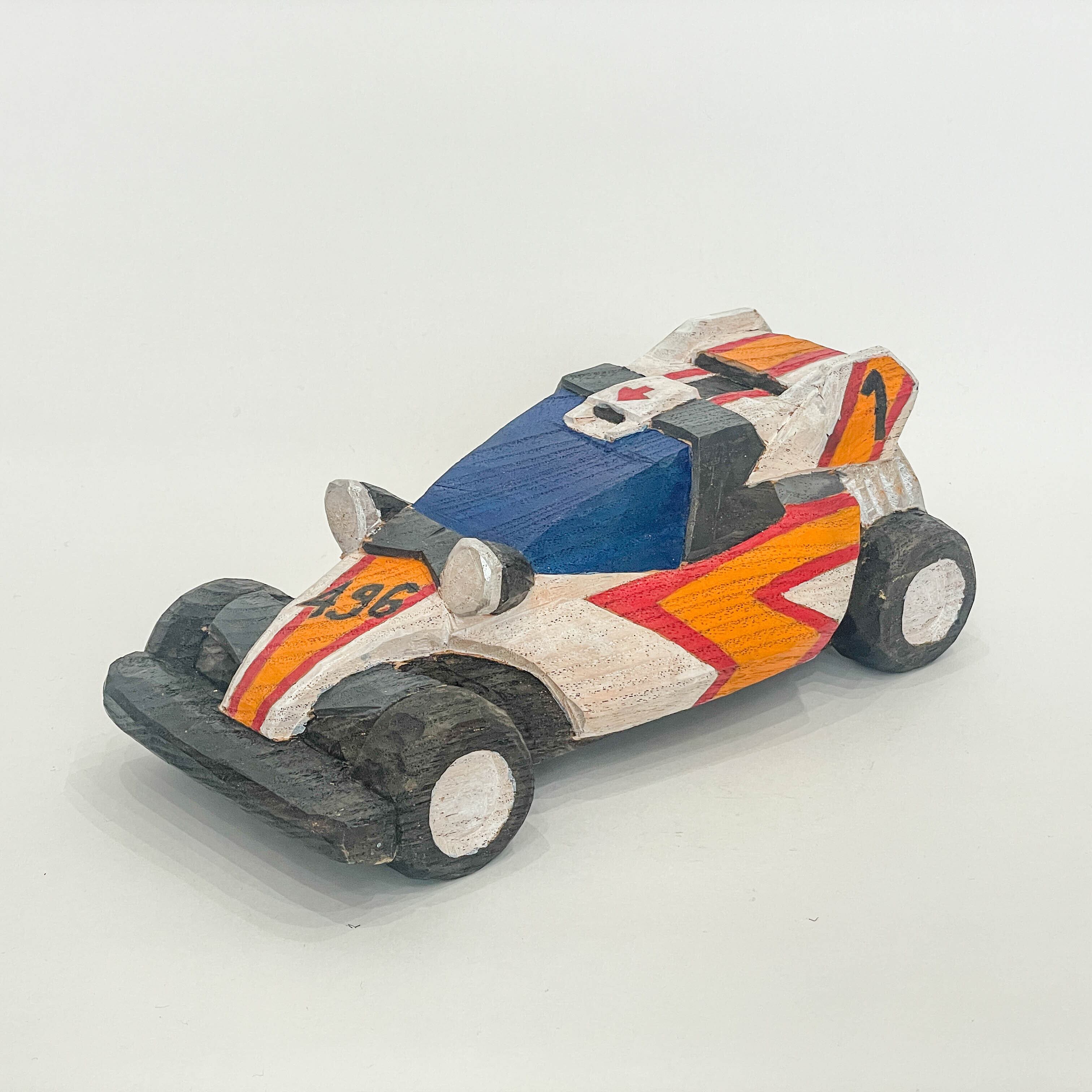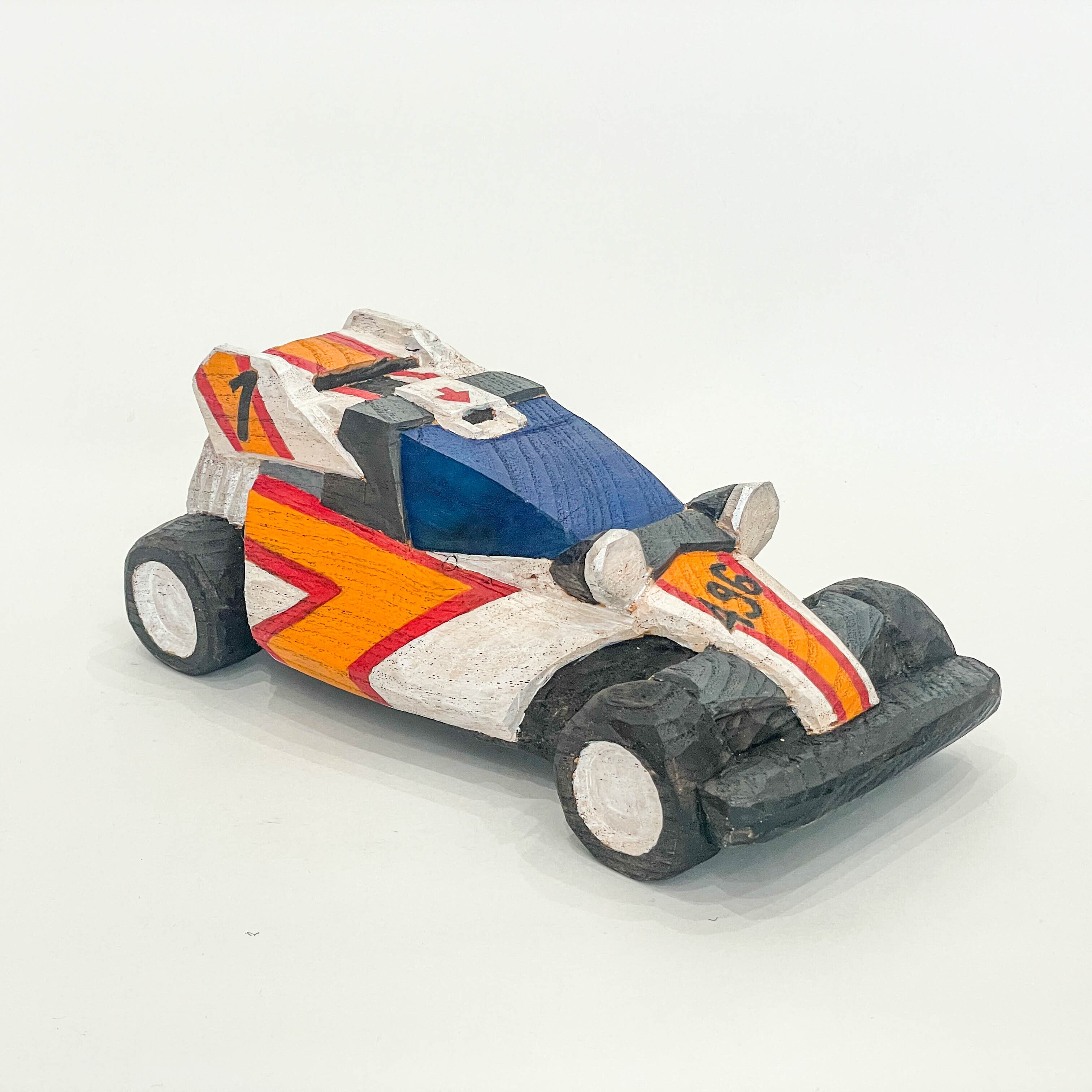 自身の愛車を彫ったことを発端に、映画やアニメに登場するスーパーカーや実在の旧車などをモデルとし、写真をもとに想像を織り交ぜながら制作された多種多様な車たちは、フィギュアのような緻密さはなくとも、それぞれの車が持つ特徴が的確に捉えられ、木独特の温かみを感じさせてます。