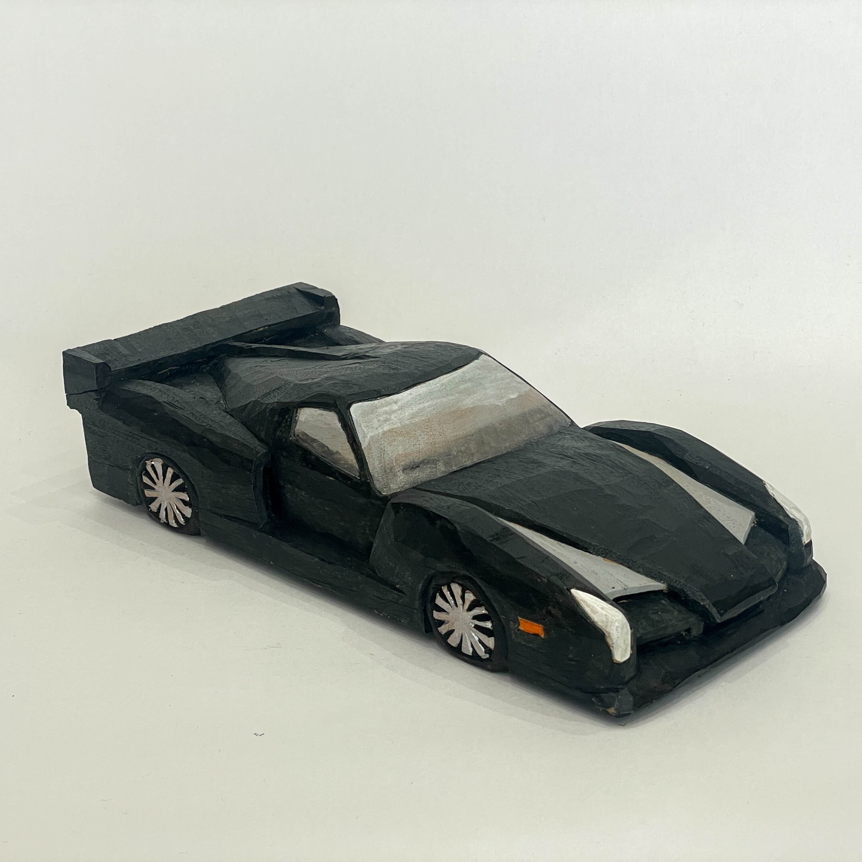 自身の愛車を彫ったことを発端に、映画やアニメに登場するスーパーカーや実在の旧車などをモデルとし、写真をもとに想像を織り交ぜながら制作された多種多様な車たちは、フィギュアのような緻密さはなくとも、それぞれの車が持つ特徴が的確に捉えられ、木独特の温かみを感じさせてます。